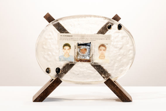 resina poliéster, fotos 3x4, sementes de mucuna (testogênicas), recorte de bula de Nebido® na seção